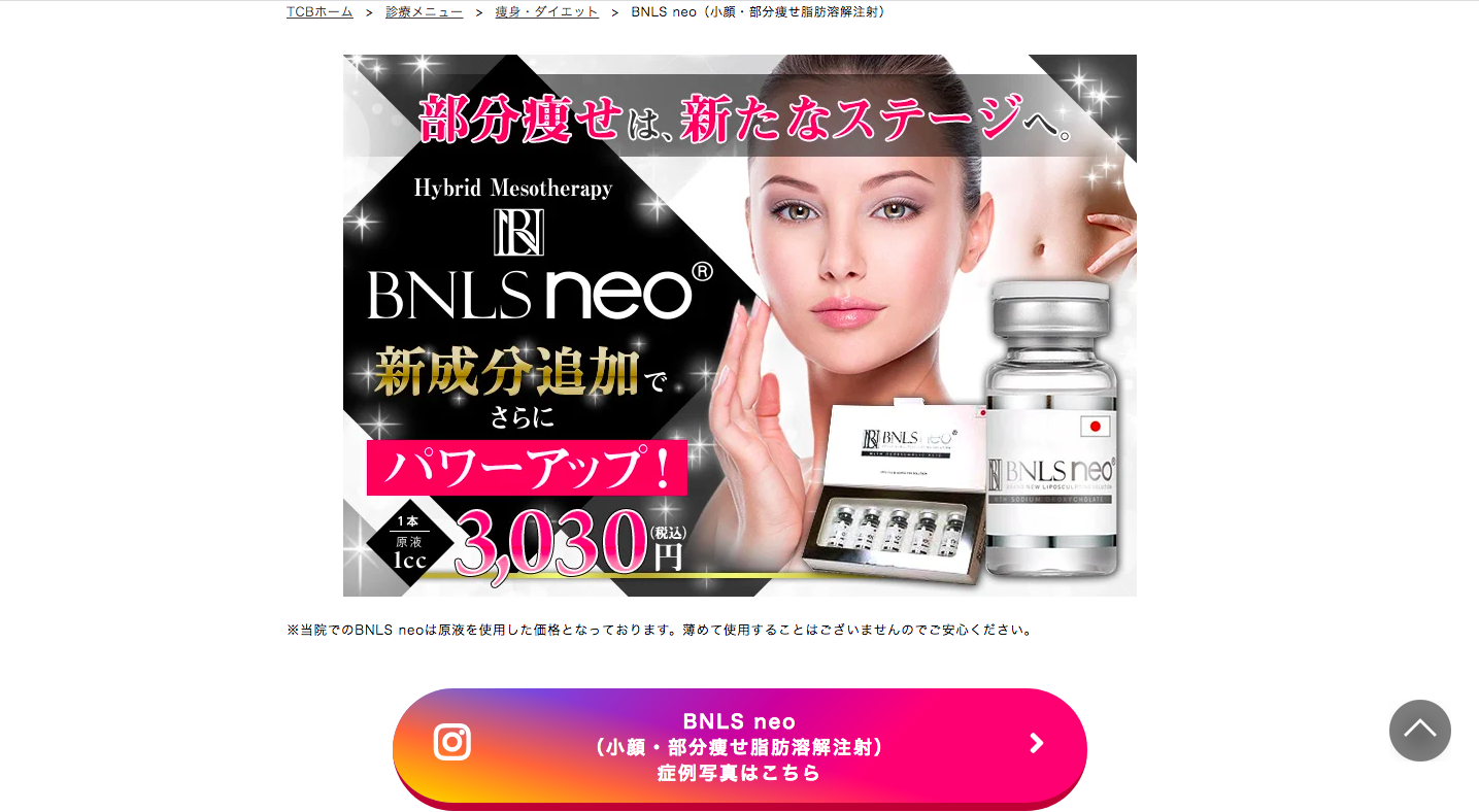 取り扱っているBNLS注射は「BNLS neo」で従来のものよりも負担が少なく、効果も期待できる脂肪溶解注射だと言われています。